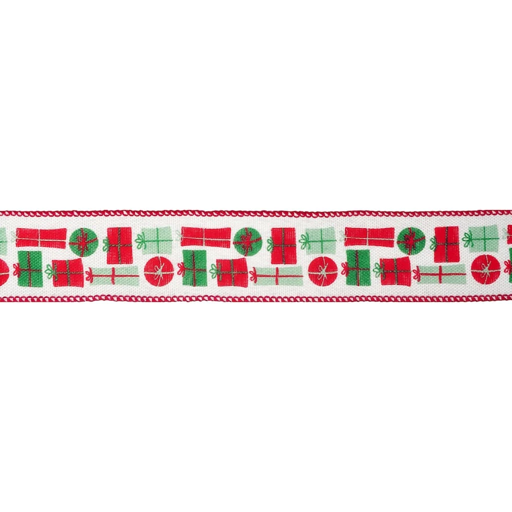 Give your Christmas gifts and crafts a bit of cheer with this wired faux linen ribbon from Celebrate It. With a festive gift box pattern, use to embellish ornaments, pair with lights and greenery for charming garlands and wreaths, put the finishing touch on presents and more!