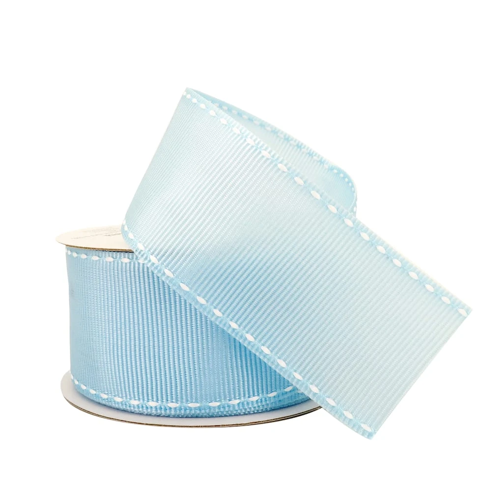 Give your gifts and crafts a fun touch of charm with this light blue grosgrain ribbon with white stitching along the edges from Celebrate It. Use to craft festive wreaths and garlands, add bows and other embellishments to apparel projects or put the finishing touch on a present for someone special.