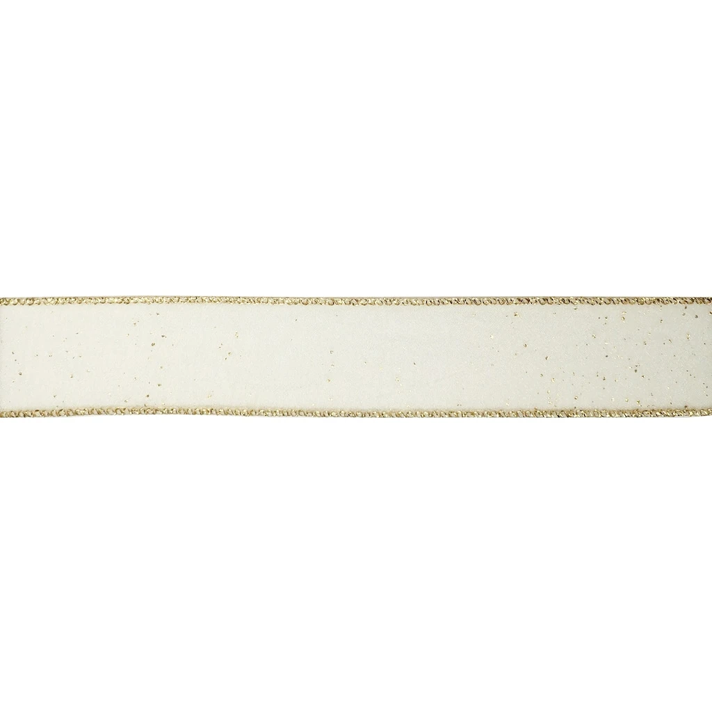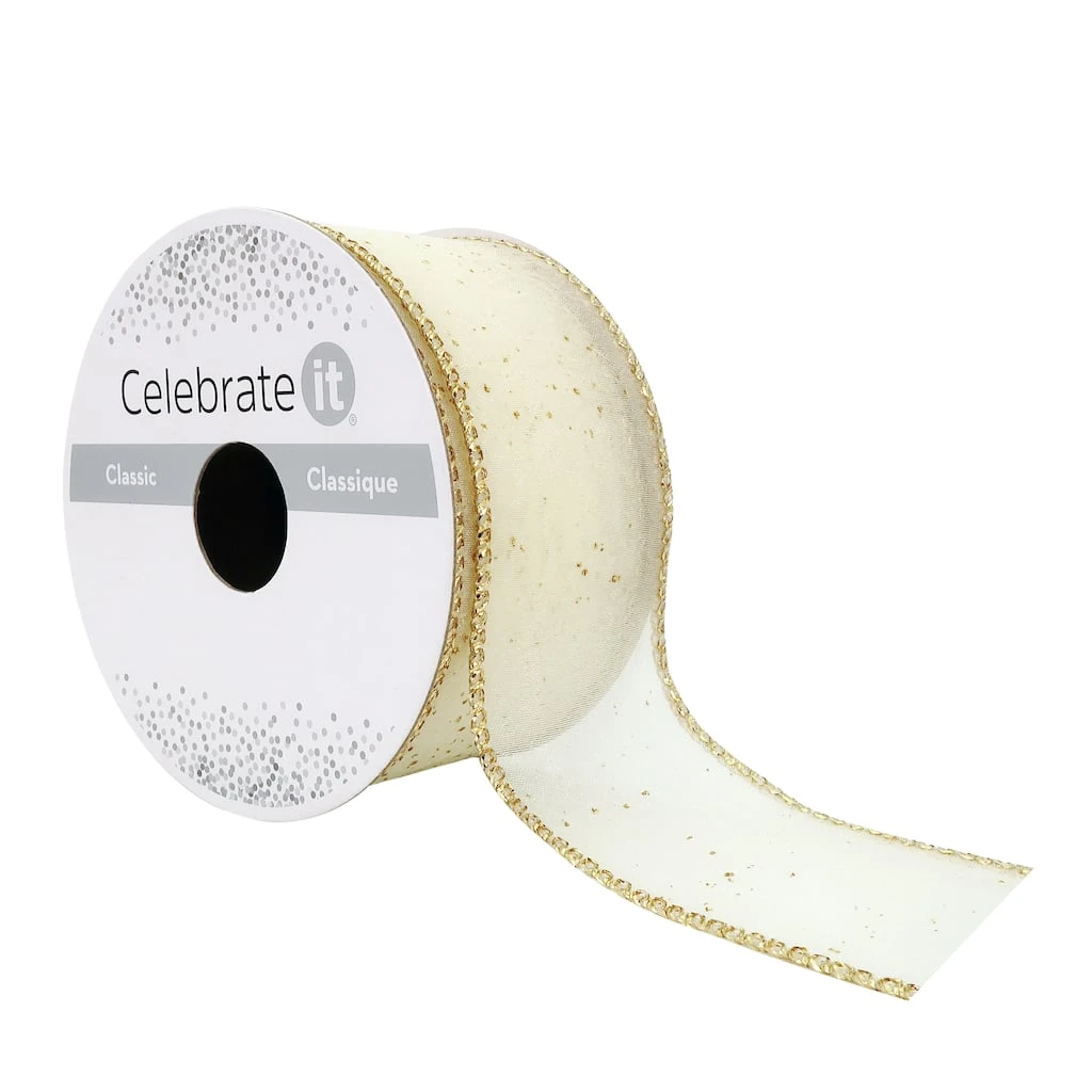 Give your gifts and crafts a fun touch of charm with this wired sheer gold ribbon with sparkly accents from Celebrate It. Use to craft festive wreaths and garlands, add bows and other embellishments to apparel projects or put the finishing touch on a present for someone special.