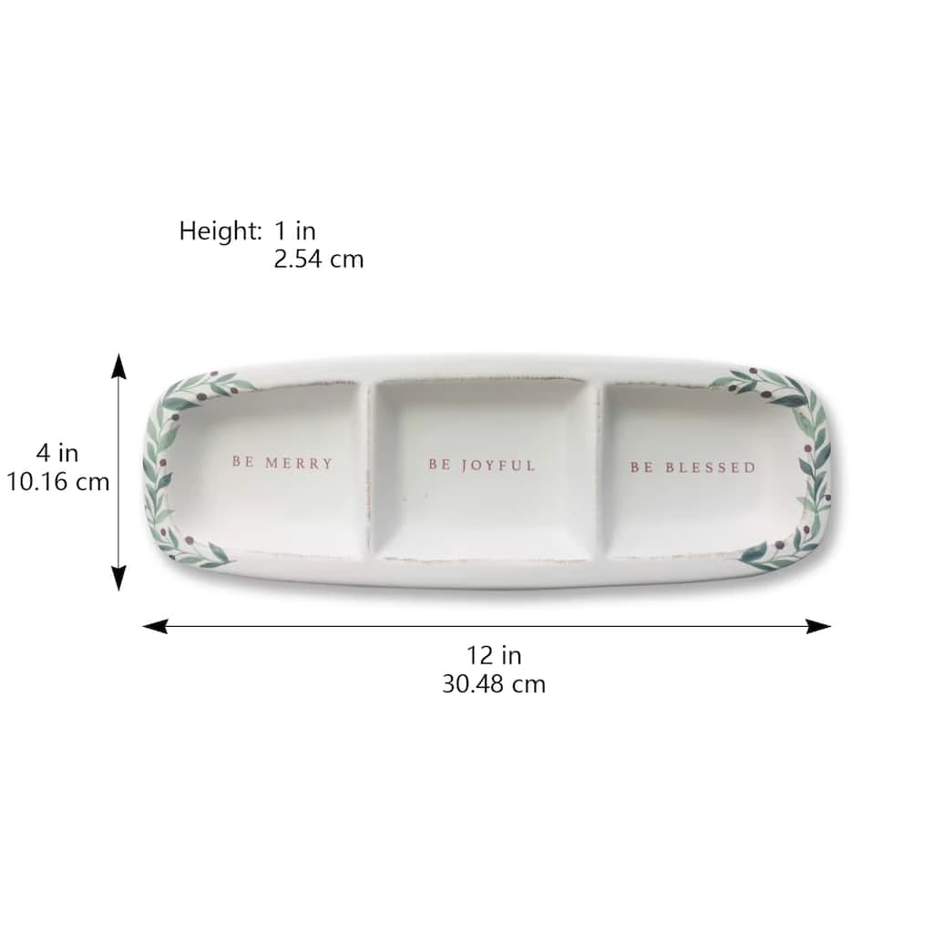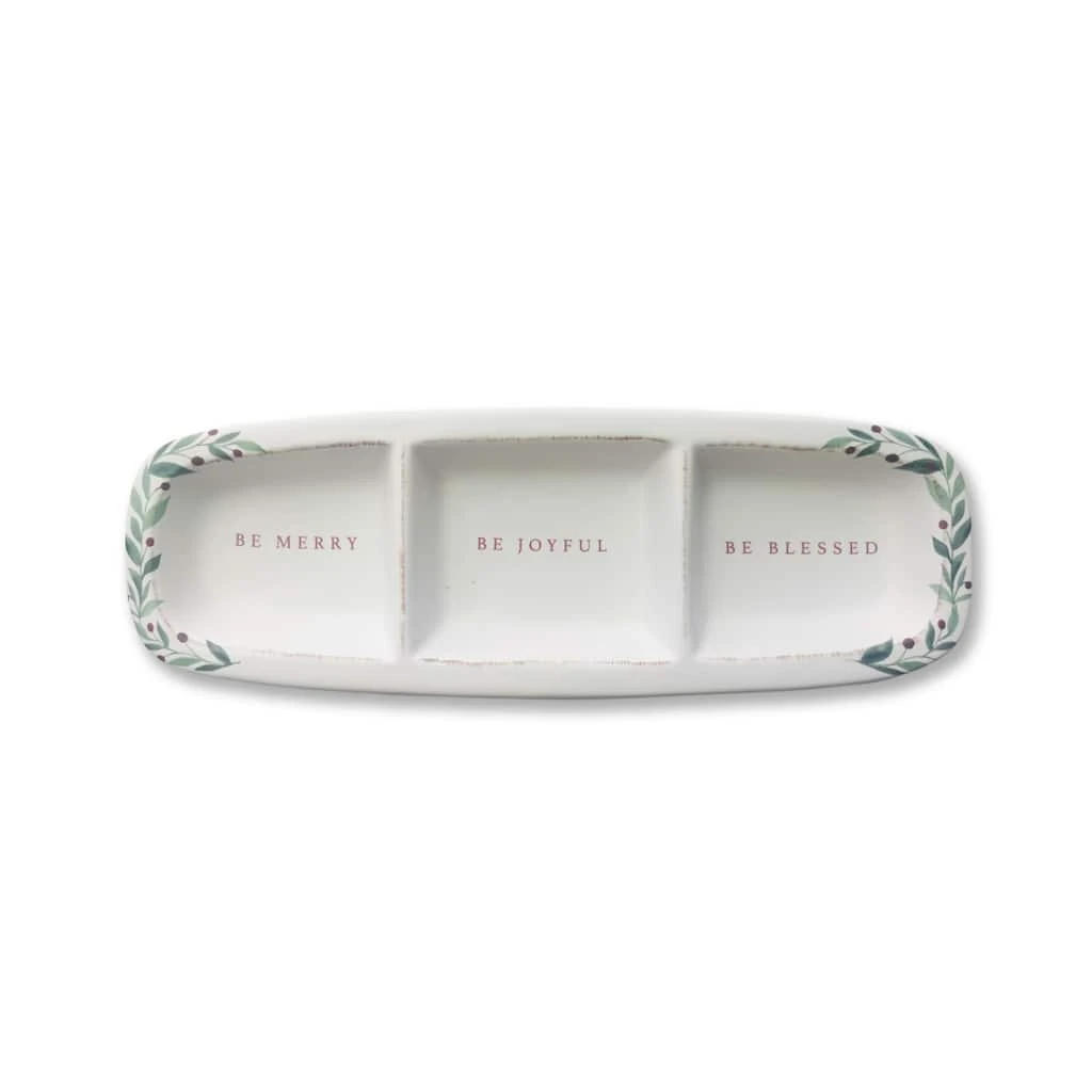 Give your holiday meal a charming flourish with this lovely ceramic party platter divided into three sections. This white dish featuring festive berry and leaf accents and a cheerful message in each section is a wonderful way to serve delicious party snacks and desserts to your friends and family as you celebrate the Christmas season together.