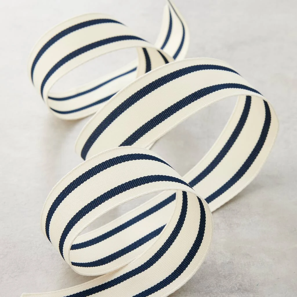 Add this ribbon to your gift wrapping and DIY projects. This polyester ribbon with a navy ticking striped accents will be a lovely addition to your finished projects.