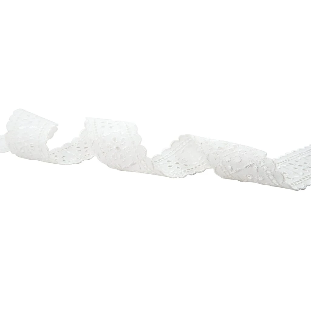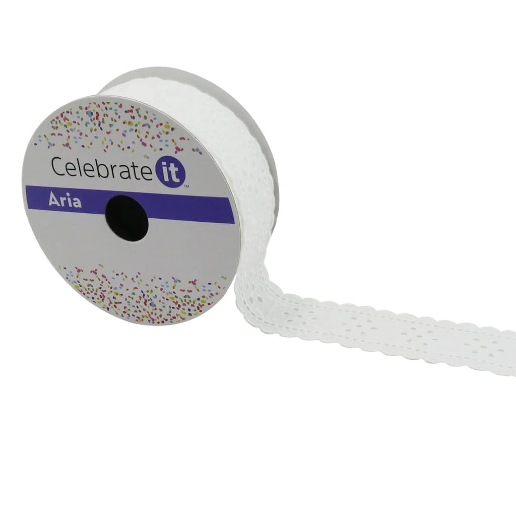Accentuate your rustic burlap wreath with this charming white lace by Celebrate It. This gorgeous ribbon is perfect to decorate your vintage-inspired throw pillows, drapes, upholstery and more.
