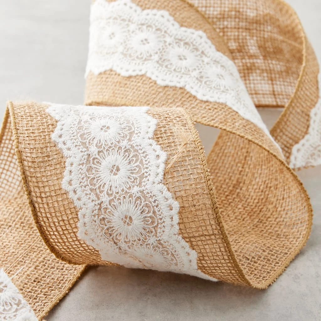 Rustic burlap and delicate lace combine to create this trendy ribbon.Β This beautiful woven ribbon with sewn edges can be utilized in a variety of ways such as decorating chairs for your next special occasion.