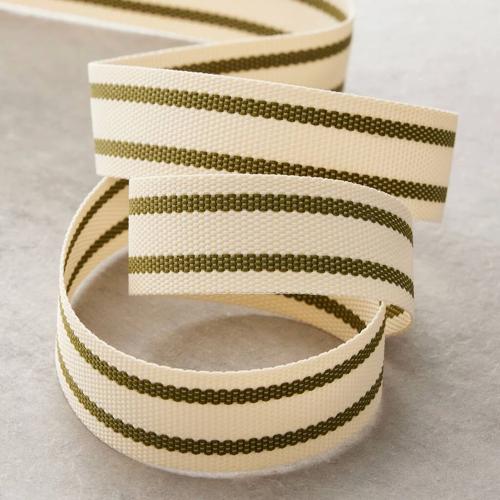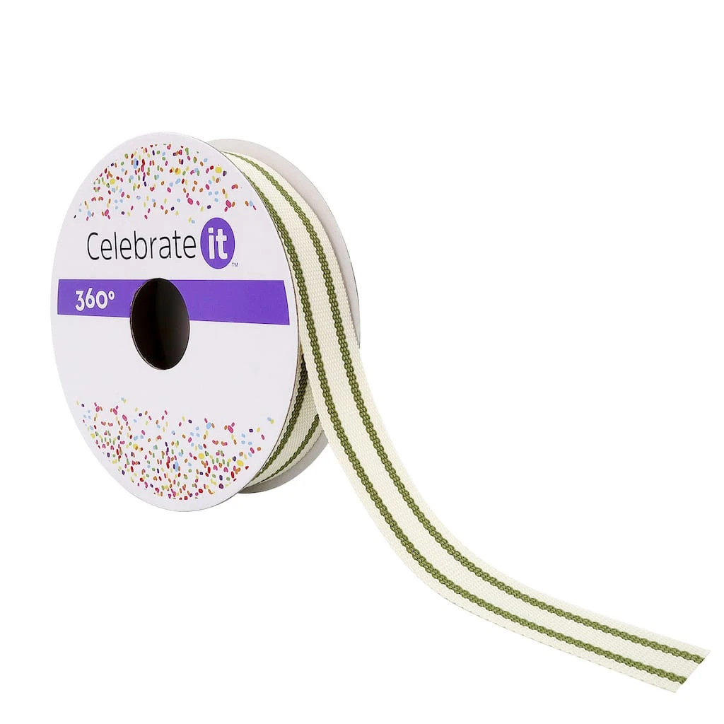 Add this ribbon to your gift wrapping and DIY projects. This polyester ribbon with a olive ticking striped accents will be a lovely addition to your finished projects.
