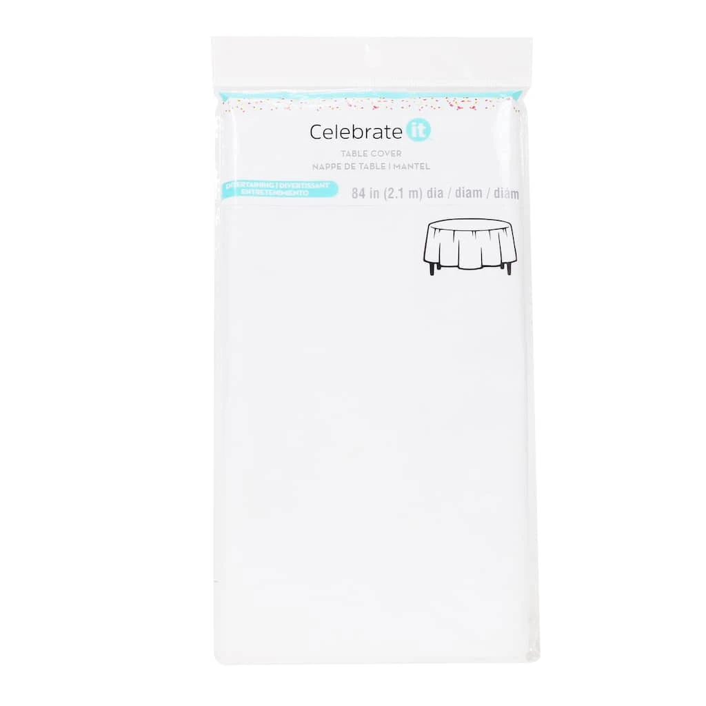 You can complement your stylish, contemporary home décor with this white table cover by Celebrate It. Metallic plates, cutlery, flower vases, and candle votives will stand out beautifully on this plain, round cover.