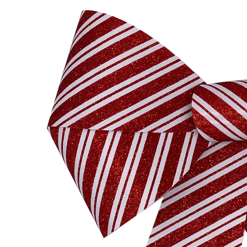 Give your holiday gifts and craft projects Christmas cheer with a lovely touch of shimmer with this glitter accented candy cane striped bow. This charming bow is ideal for pairing with lights and greenery to create a festive garland or wreath, dressing up your tree, putting the finishing touch on a special present and more!