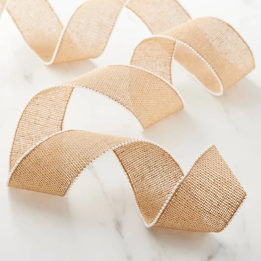 Rustic burlap and delicate pearl-like beads combine to create this simple yet elegant ribbon. This woven burlap with beaded edges can be utilized in a variety of ways to accent your wedding dΓ©cor, gift baskets, gift wrap or other craft projects.Β The wired edges, finished with white beads, help the ribbon maintain its shape.