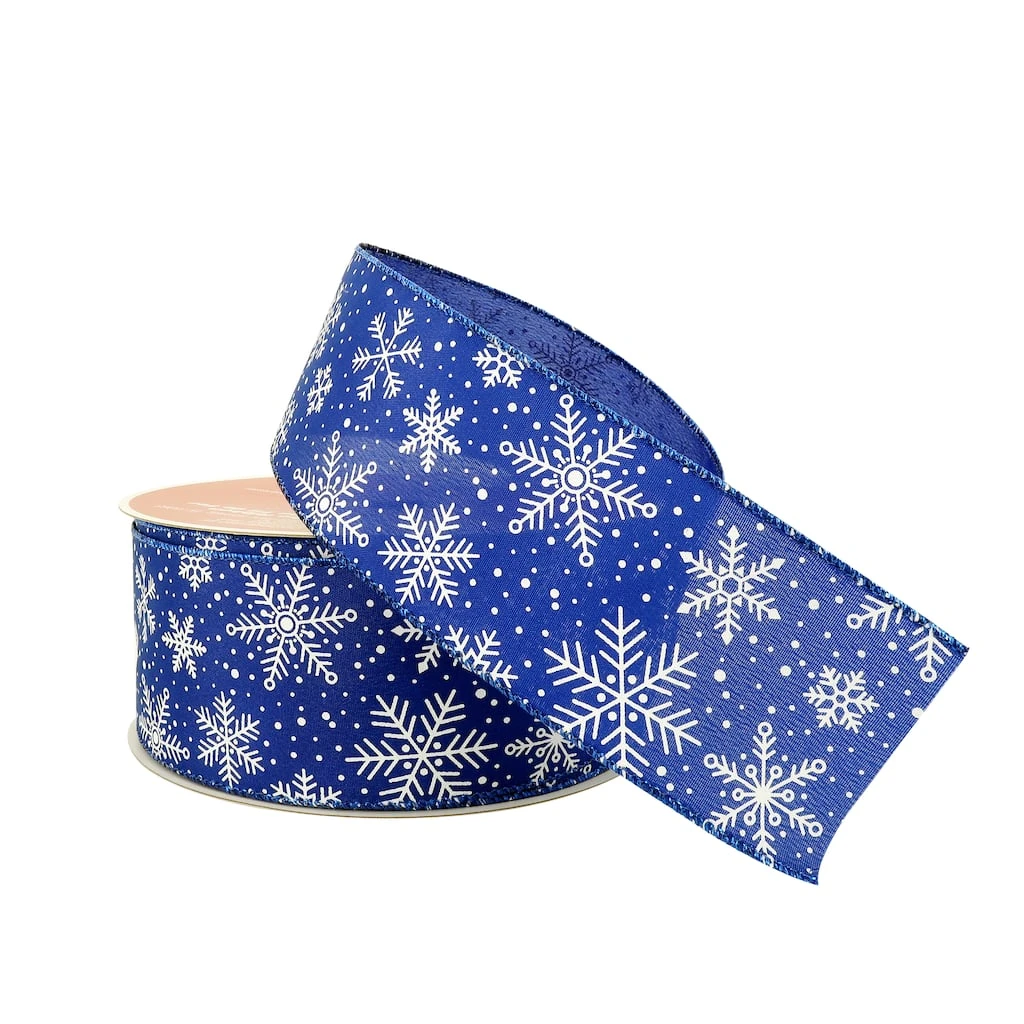 Give your Christmas gifts and craft projects a lovely bit of holiday charm with this wired blue taffeta ribbon with a snowflake pattern from Celebrate It. Use to embellish ornaments, pair with lights and greenery to create festive garlands and wreaths, dress up floral arrangements, put the finishing touch on presents and more!