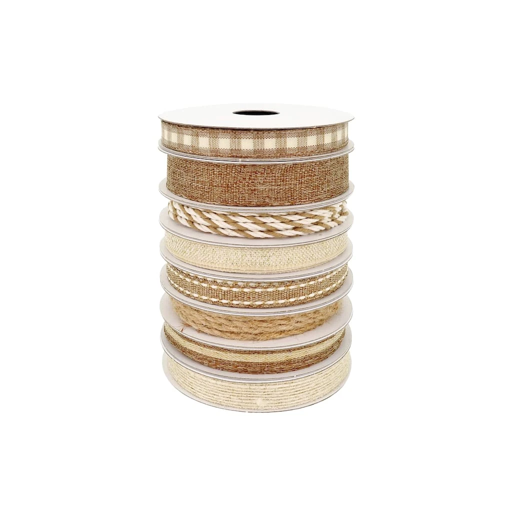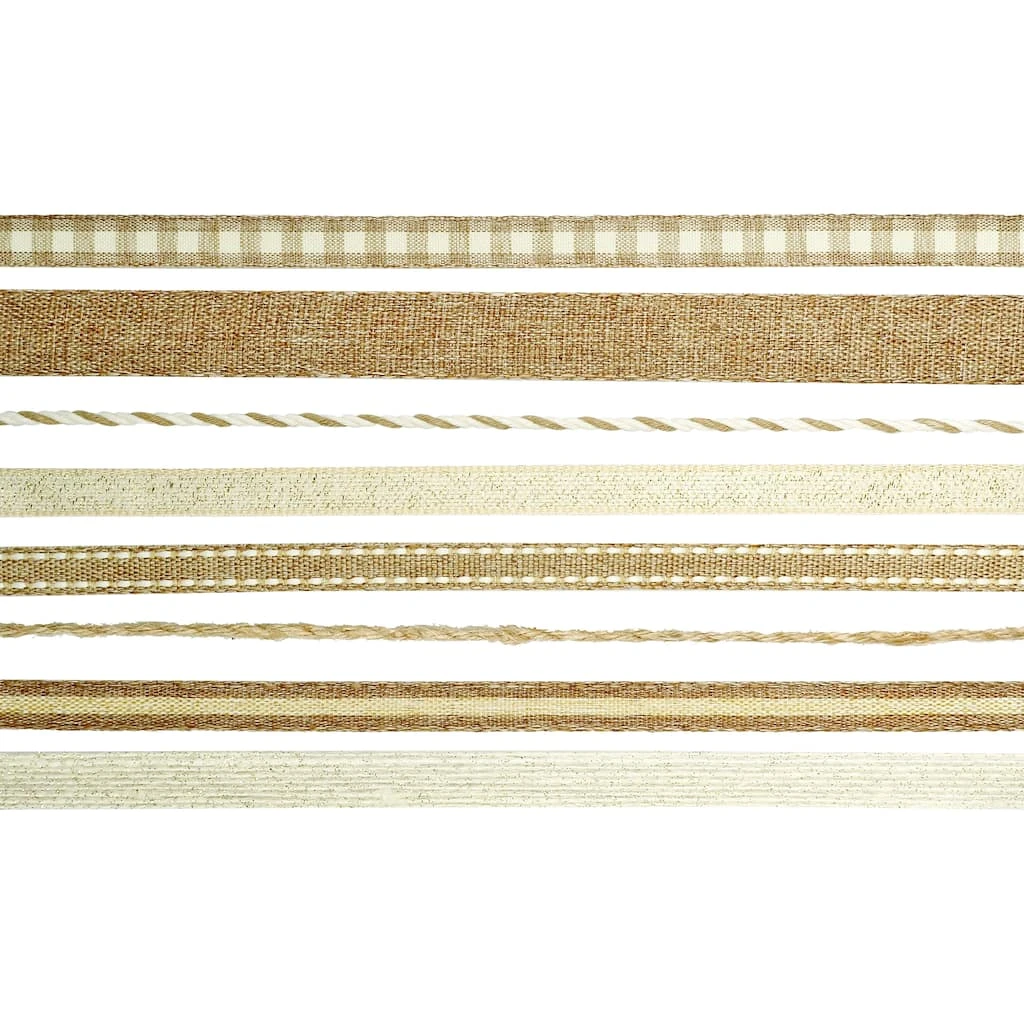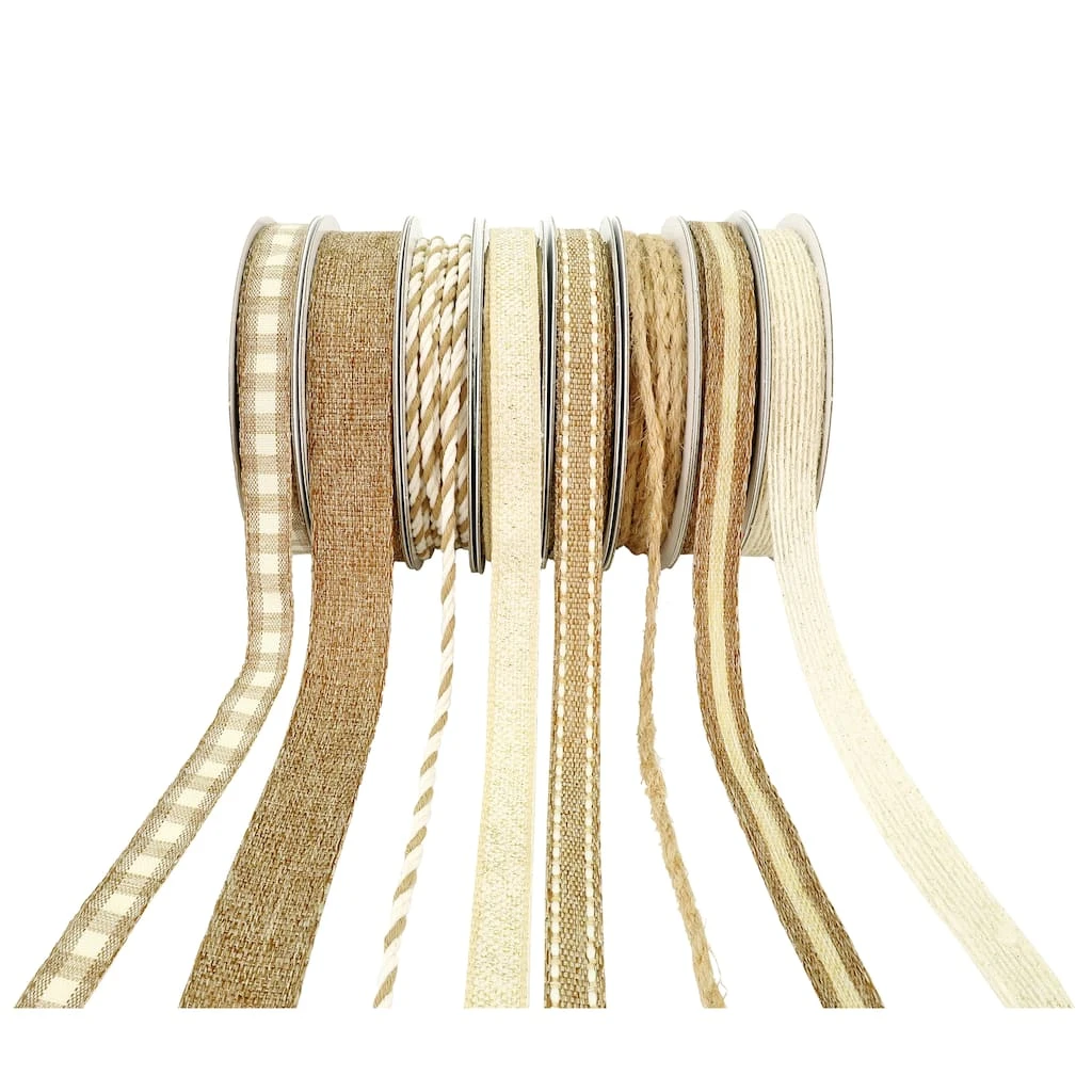 - Pack includes polyester, cotton, metallic, jute, and nylon ribbon pieces