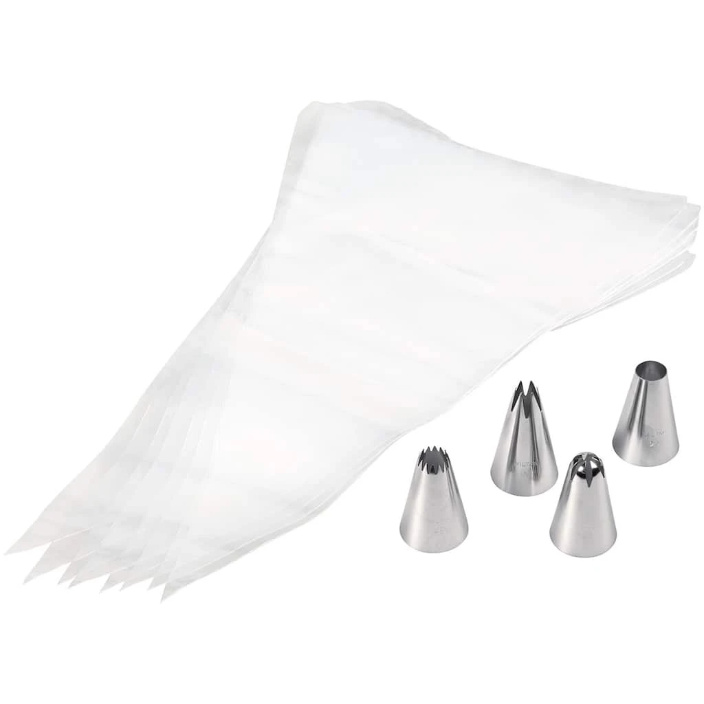 Create all kinds of fun cupcake designs perfect for celebrations, or as everyday treats! With time-saving disposable bags and four different tips to experiment with, it’s easy to master your favorite decorating techniques. From brownies and cookies to cupcakes and cake pops, every confection gets your creative touch with this easy-to-use set. You can do so much with this assortment of cake decorating tips: The 1M open star tip beautifully ices an entire cupcake with a stunning swirl and also lets you make rosettes, stars and drop flowers. The 2A round tip pipes large smooth coils of icing, perfect to top your cupcake, or jumbo pulled dots or beads. Use the 4B open star tip creates more of a starburst design, great for detailed pulled stars. The 2D drop flower tip lets you make beautiful drop flowers with just a turn of your wrist and also makes a great swirl to top a cupcake. Plus, with eight disposable decorating bags, you can have a rainbow of icings or assortment of fillings at your fingertips.