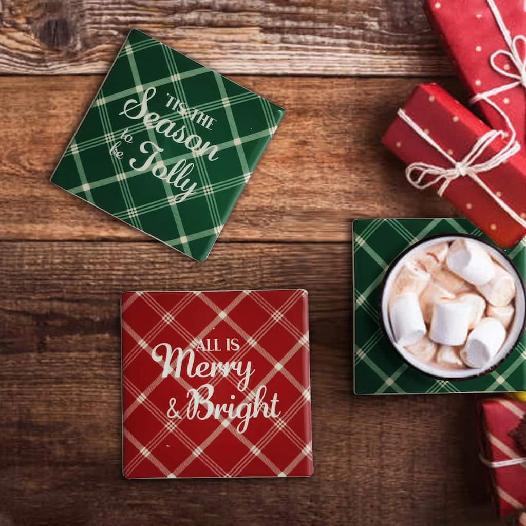 Give your holiday festivities a charming flourish with this lovely ceramic coaster. This cheerful piece featuring a plaid design and a friendly seasonal sentiment is a wonderful way to serve delicious cocktails and hot beverages to your friends and family as you celebrate the Christmas season together.