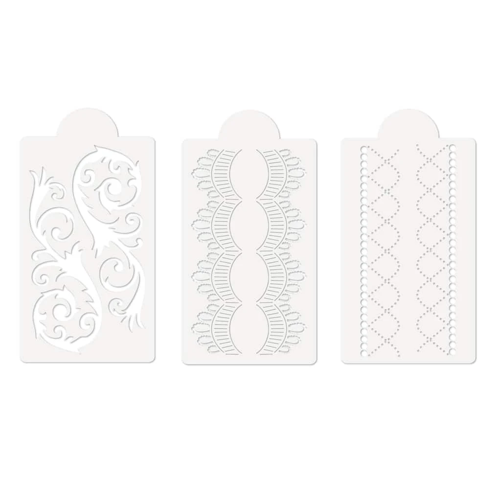 Add fun decorative patterns to cakes and other sweet treats with these stencils! Use with frosting or airbrushing, this set includes elegant prints to customize how you like.