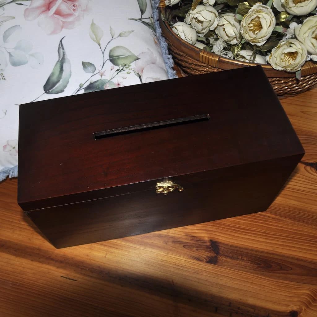 Add this espresso card box to your special occasion. Place it on a table so your guests can set their thoughtful cards safely inside.