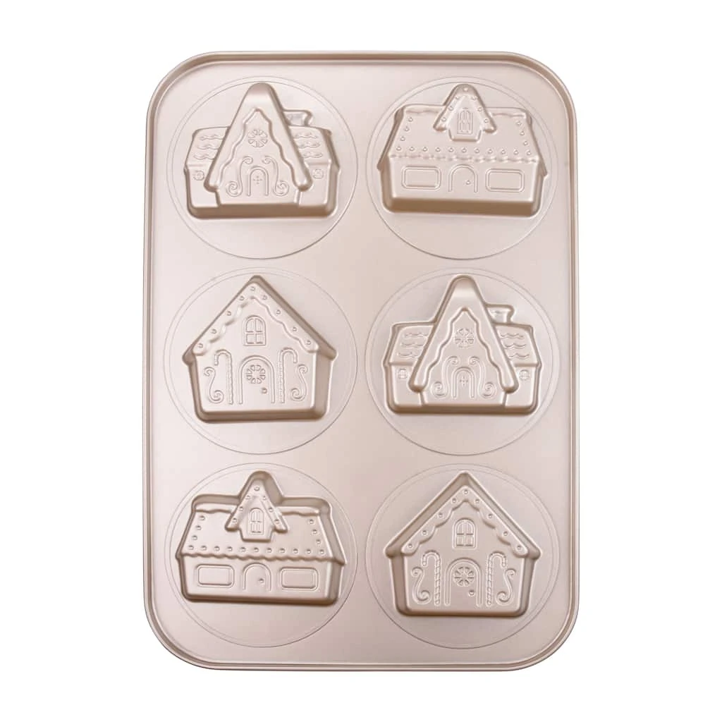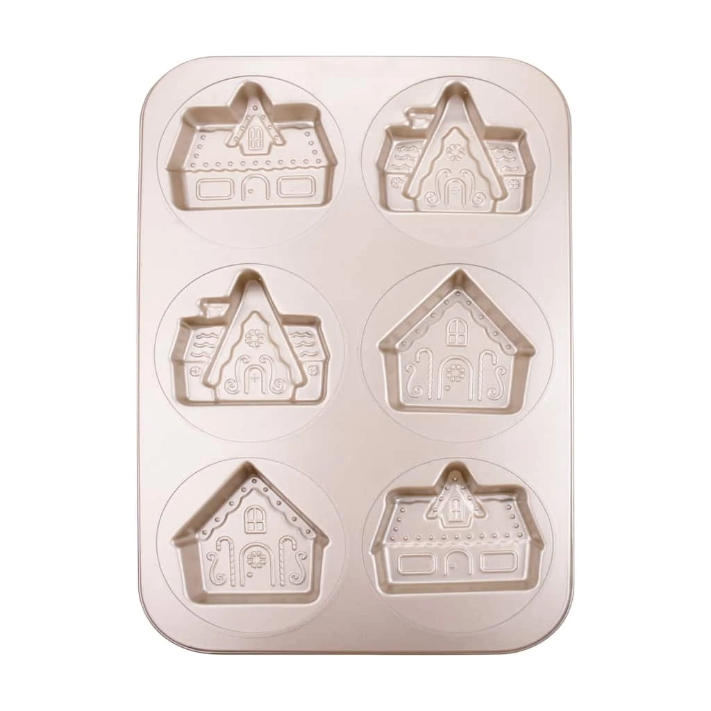 Create fun and tasty treats with this 6-cavity cake pan. It features gingerbread house designs stamped in gold carbon steel material. Durable, yet, lightweight, this pan will be a great addition to you holiday baking tools.