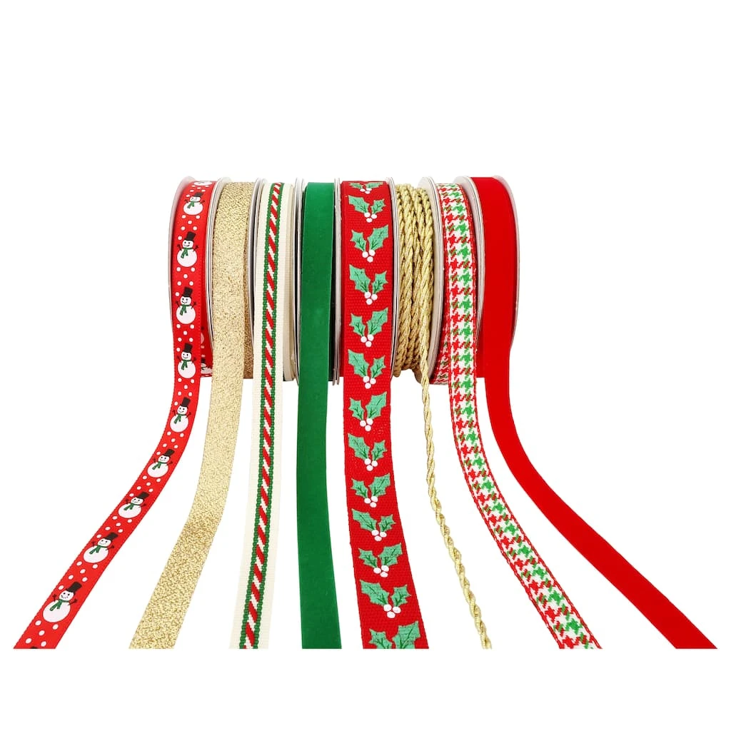 Give your Christmas crafts a lovely bit of sparkle and shine with this ribbon variety pack from Celebrate It. Use to embellish ornaments, pair with lights and greenery to create festive garlands and wreaths, dress up floral arrangements, put the finishing touch on presents and more!