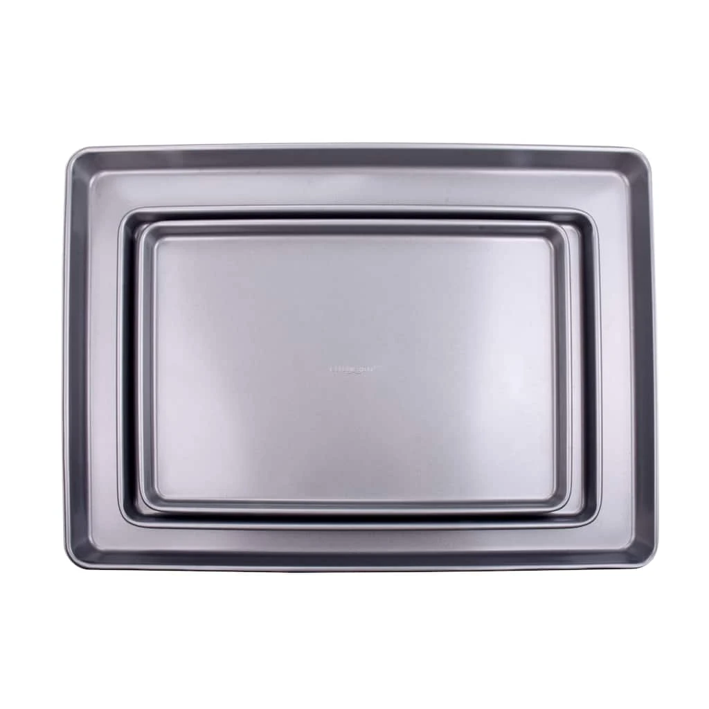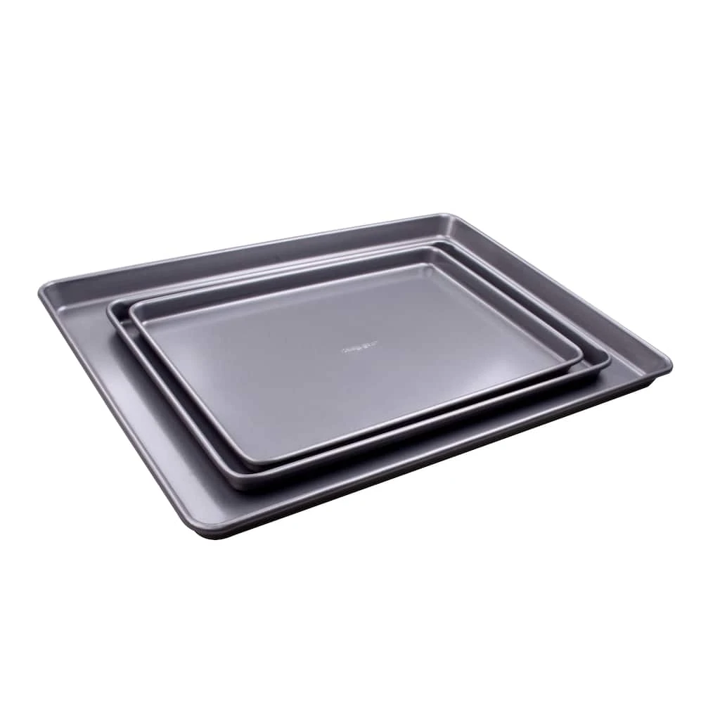 This set from Celebrate It includes baking pans in three varied sizes. You can use these trays to bake cookies, pizzas, macrons and other such delicious foods.