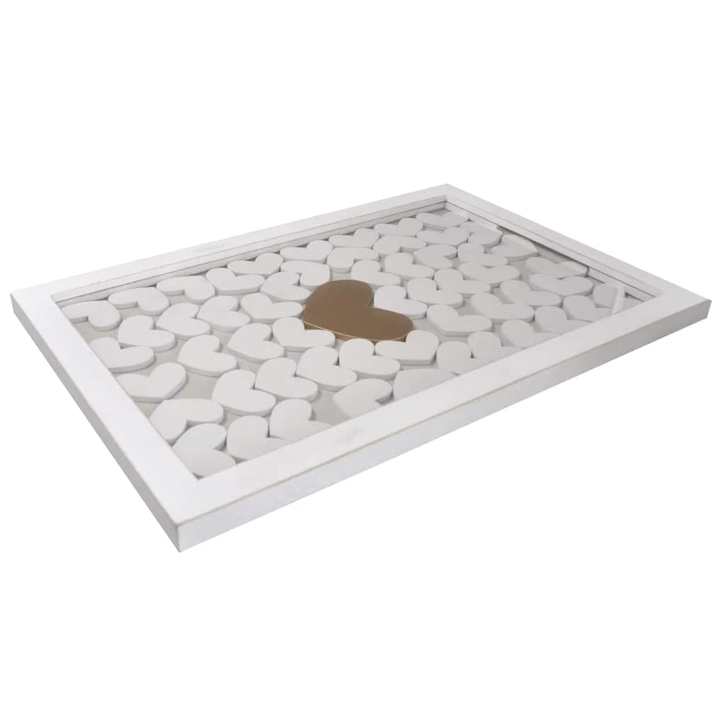 Make your special day memorable with this drop box guest book. It features white hearts where your guests can sign their names and one gold heart to highlight the happy couple. This drop box frame will become a wonderful keepsake of your wedding you can display in your home.